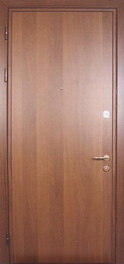 Ламинат - это доска из ДВП толщиной 4-5 мм с четырехслойным покрытием. Визуально он не отличается от натуральной древесины. Рисунок ламинированной доски может быть гладким и имитировать древесный спил или рельефным, имитирующим структуру дерева. Разнообразная цветовая гамма этого материала позволяет изготовить дверь, которая будет отлично смотреться в интерьере как квартиры, так и офиса.